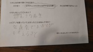 「発表会でおかしがもらえること」と書いてくれた男の子がいました。